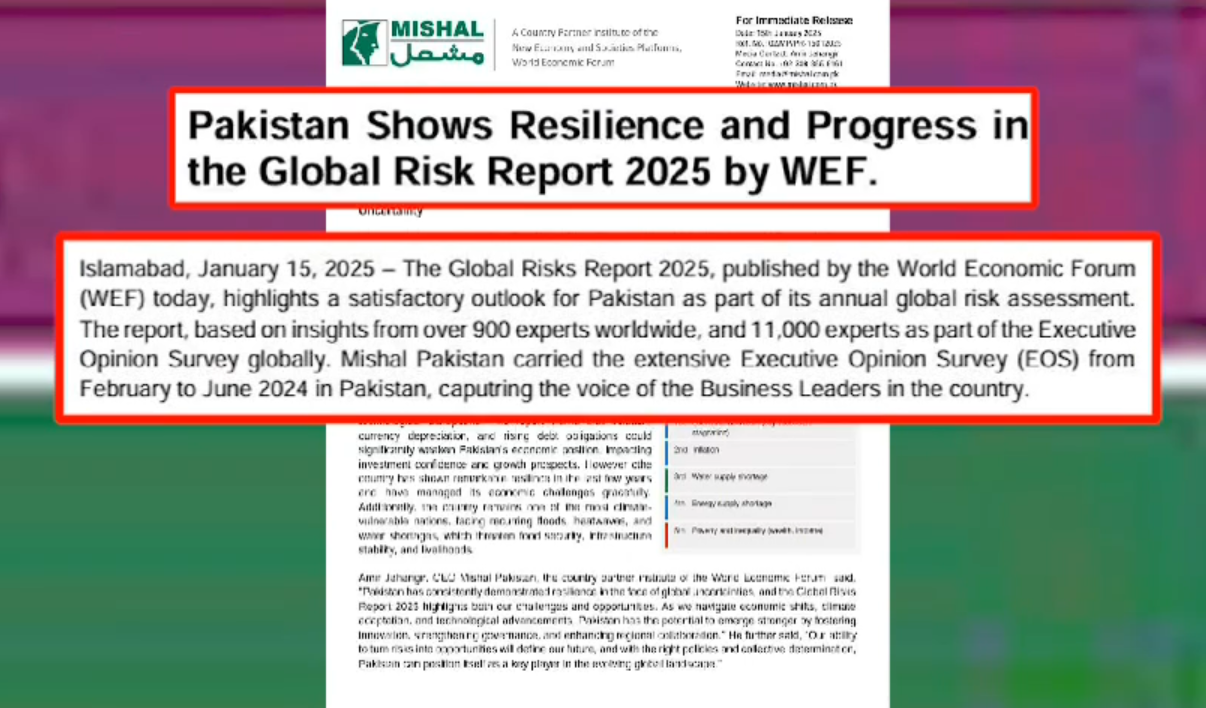 گلوبل رسک رپورٹ 2025، میں عالمی خطرات کے تناظر میں پاکستان کی اطمینان بخش کارکردگی کو نمایاں کیاگیا ۔پاکستان عالمی سطح پر درپیش اقتصادی، ماحولیاتی، سیاسی اور تکنیکی چیلنجزسے نمٹنےکی بھرپور صلاحیت رکھتا ہے۔