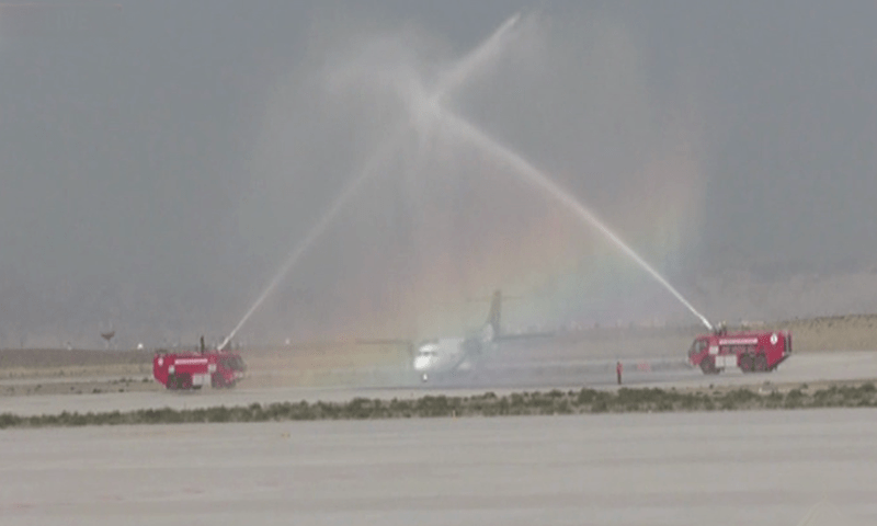 کراچی سے نیو گوادر انٹرنیشنل ائیرپورٹ کے لیے روانہ ہونے والی افتتاحی پرواز کا گوادر ائیرپورٹ  پر واٹر سیلوٹ سے استقبال کیا گیا۔