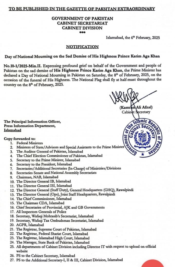 پرنس کریم آغا خان کی تدفین کے موقع پہ ملک بھر میں سوگ منایا جائے گا۔۔۔ 8 فروری کو ملک بھر میں قومی پرچم سرنگوں رہے گا۔۔۔