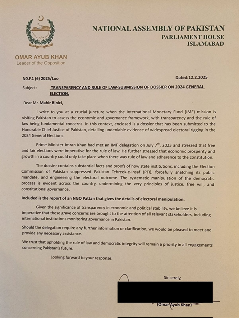 عمر ایوب نے کہا میں یہ خط اہم موڑ پر لکھ رہا ہوں جب(IMF) کا مشن معاشی اور گورننس فریم ورک کا جائزہ لینے کے لیے پاکستان کا دورہ کر رہا ہے،۔۔۔جس میں شفافیت اور قانون کی حکمرانی بنیادی نقاط ہیں۔۔۔اس تناظر میں ایک ڈوزیئر بھی ساتھ ارسال کیا جا رہا ہے۔۔۔جو معزز چیف جسٹس آف پاکستان کو پیش کیا جا چکا ہے۔۔جس میں وسیع پیمانے پر انتخابی دھاندلی کے ناقابل تردید شواہد کی تفصیل دی گئی ہے۔