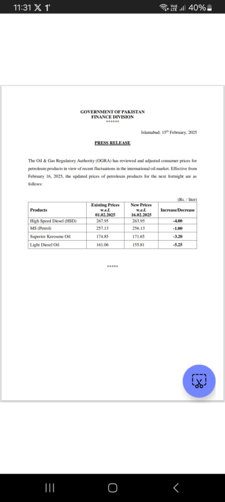 حکومت نے 16 فروری سے پیٹرولیم مصنوعات کی قیمتوں میں 4 روپے فی لیٹر تک کی کمی کر دی۔۔۔