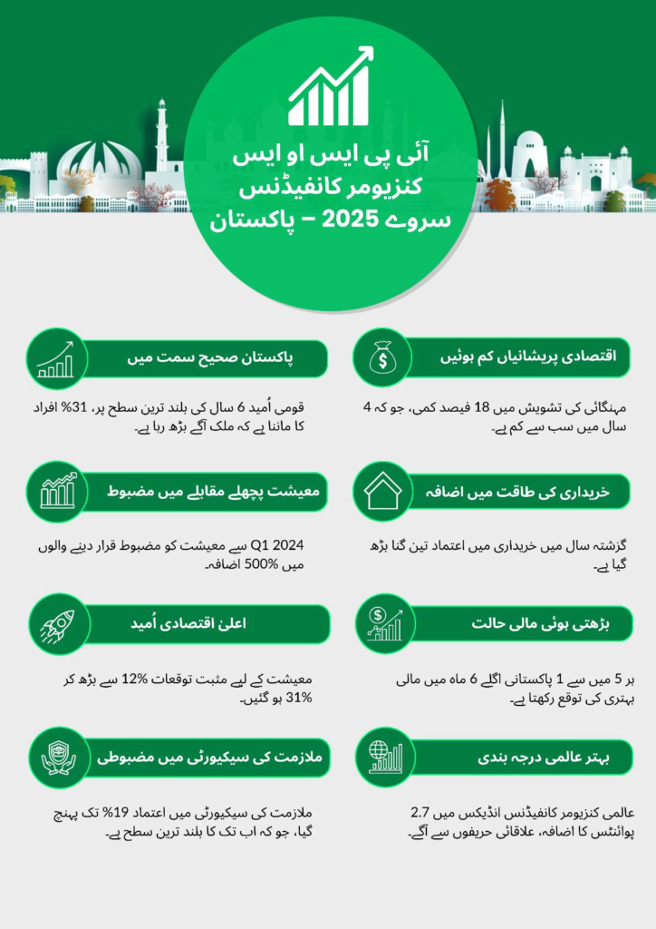 عوام کی جانب سے مقامی معاشی حالات میں پُرامیدی کی شرح میں 2025ء میں 31 فیصد کی نمایاں بہتری دیکھنے میں آئی ہے۔۔۔پاکستانی صارفین کے اعتماد کو جاننے والے سروے میں اب تک اعتماد کی شرح بلند ترین سطح پر ہے۔۔۔
