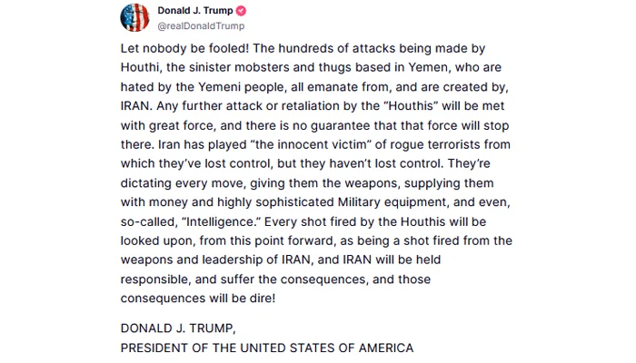اپنے سوشل میڈیا پلیٹ فارم ٹروتھ سوشل پر جاری بیان میں ٹرمپ نے کہا کہ آج کے بعد سے حوثیوں کی جانب سے چلائی گئی ایک گولی کے بارے میں بھی یہ سمجھا جائے گا کہ یہ ایرانی ہتھیاروں اور ایرانی قیادت کی جانب سے چلائی گئی ہے۔