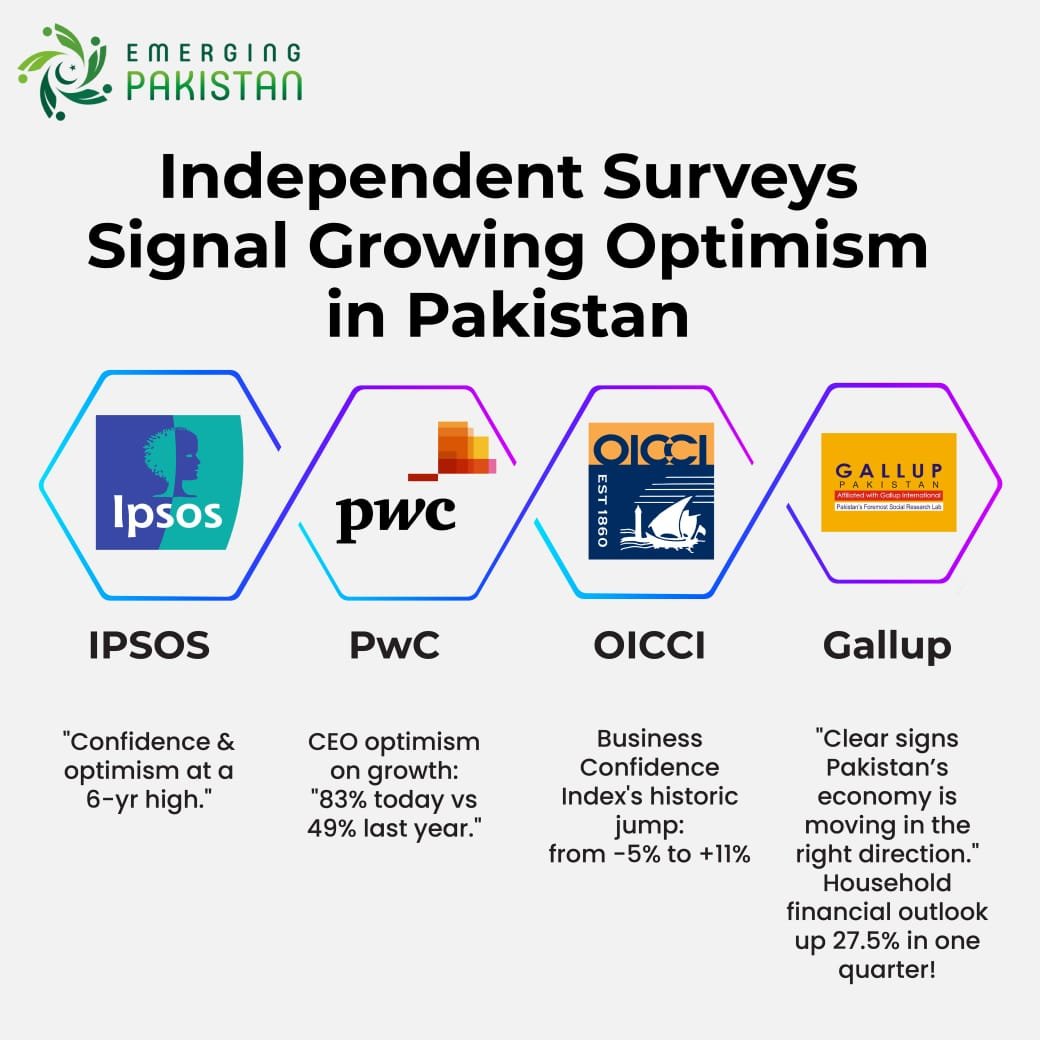 اوورسیز انٹرنیشنل چیمبر آف کامرس اینڈ انڈسٹری کی رپورٹ میں کہا گیا کہ پاکستان میں کاروباری اعتماد کا انڈیکس چھ سال کی بلند ترین سطح پر پہنچ گیا۔۔ بزنسں کانفیڈنس انڈیکس میں بڑا جمپ آیا جو 5 سے بڑھکر 11 فیصد ہوگیا۔