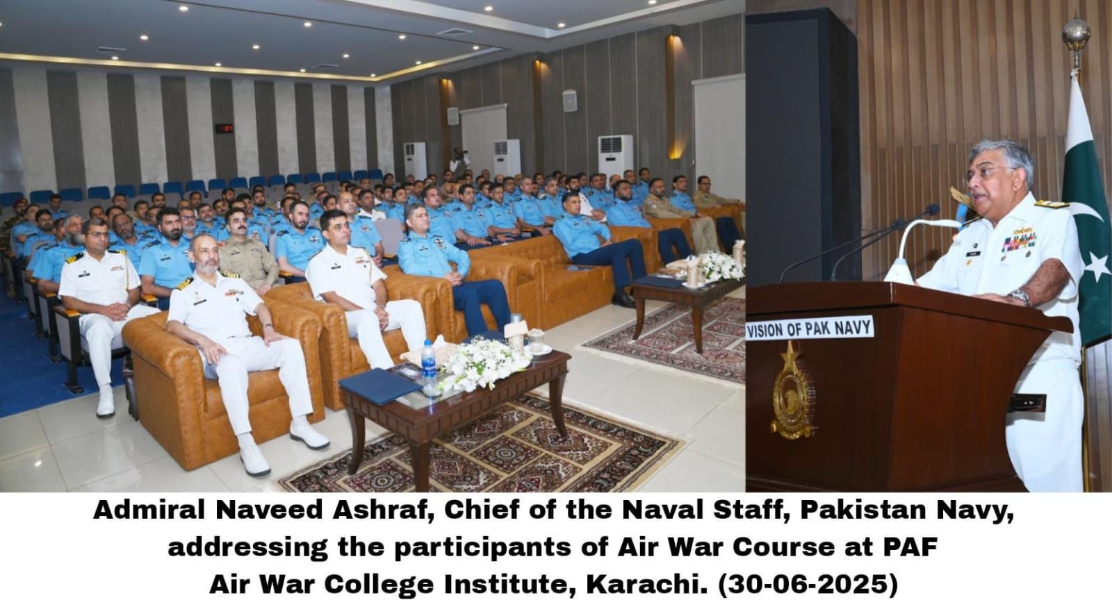 نیول چیف نے پاک فضائیہ کی پیشہ ورانہ و علمی کارکردگی کو سراہا۔۔ نیول چیف نے جدید جنگی تقاضوں کے مطابق فوجی قیادت کی تربیت کو اہم قرار دیا۔۔ م۔