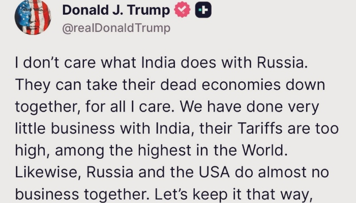 سوشل میڈیا سائٹ ٹرتھ پر جاری بیان میں صدر ٹرمپ نے کہا کہبھارت اور روس اپنی مردہ معیشت کو ایک ساتھ نیچے لے جاسکتے ہیں اور مجھے اس کی فکر ہے۔