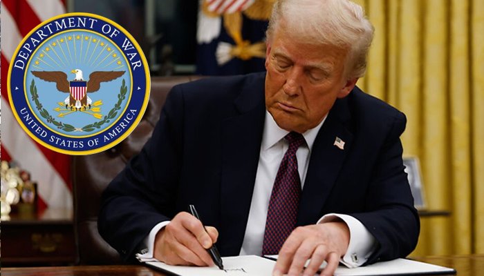 واضح رہے کہ حکم نامے پر دستخط کے موقع پر پینٹاگون کے سربراہ پیٹ ہیگستھ بھی ٹرمپ کے ساتھ موجود تھے، جو اب سیکرٹری آف وار کہلائیں گے۔