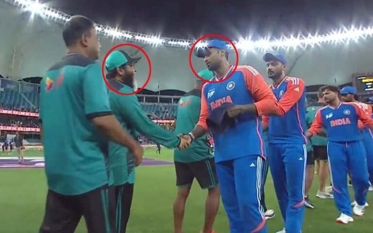 تاہم، میچ کے بعد ایک دلچسپ لمحہ دیکھنے کو سامنے آیا جب بھارتی کپتان نے پاکستان کے سابق لیگ اسپنر اور بنگلادیش کے اسپن بولنگ کوچ مشتاق احمد سے مصافحہ کیا۔