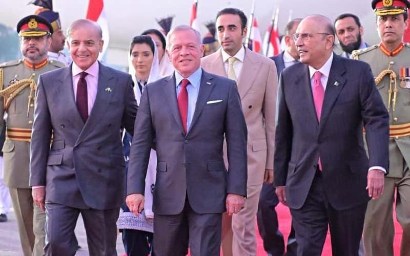 تفصیلات کے مطابق وزیراعظم شہبازشریف اور صدرمملکت آصف علی زرداری نے اردن کے شاہ عبداللہ دوم کا استقبال کیا ، استقبالیہ تقریب میں دونوں ممالک کے ترانے بجائے گئے ، مسلح افواج کے دستے نے شاہ عبداللہ دوم کو گارڈ آف آنر پیش کیا ، اردن کے بادشاہ نے گارڈ آف آنر کا معائنہ کیا جس کے بعد اپنے وفد کا وزیراعظم شہبازشریف سے تعارف کروایا ۔