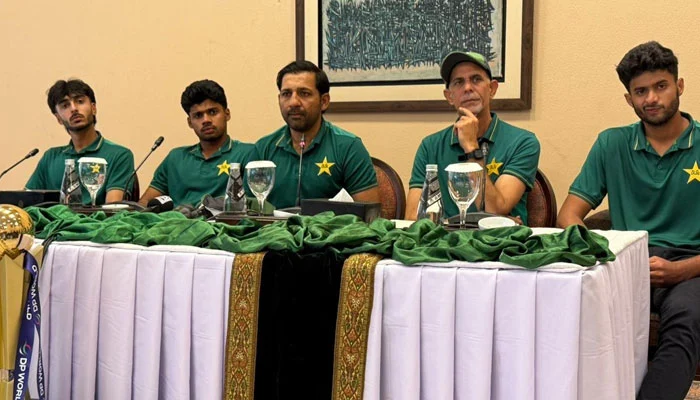 اسلام آباد میں پاکستان انڈر 19 کرکٹ ٹیم کے اعزاز میں منعقدہ تقریب کے بعد پریس کانفرنس کرتے ہوئے کپتان فرحان یوسف، ٹیم کے مینٹور سرفراز احمد، کوچز اور دیگر کھلاڑیوں نے گفتگو کی۔