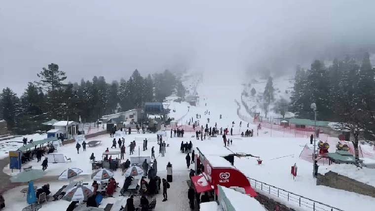 سوات: سوات میں موسم سرما کی پہلی برف باری کے بعد سیاحوں نے چیئر لفٹ، سنو فال اور قدرتی حسن کا نظارہ کرنے کیلئے مالم جبہ کا رخ کر لیا۔
