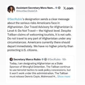 یہ موقف امریکی حکام کی جانب سے سوشل میڈیا پلیٹ فارم X پر جاری کردہ بیانات میں سامنے آیا، جہاں امریکی محکمہ خارجہ کی اسسٹنٹ سیکریٹری اور وزیر خارجہ Marco Rubio نے افغانستان کے بارے میں سخت سفری انتباہ اور طالبان کے خلاف مؤقف واضح کیا۔