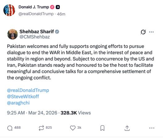 Trump shares Pakistan Prime Minister Shahbaz Sharif's statement, mediation offer draws global attention