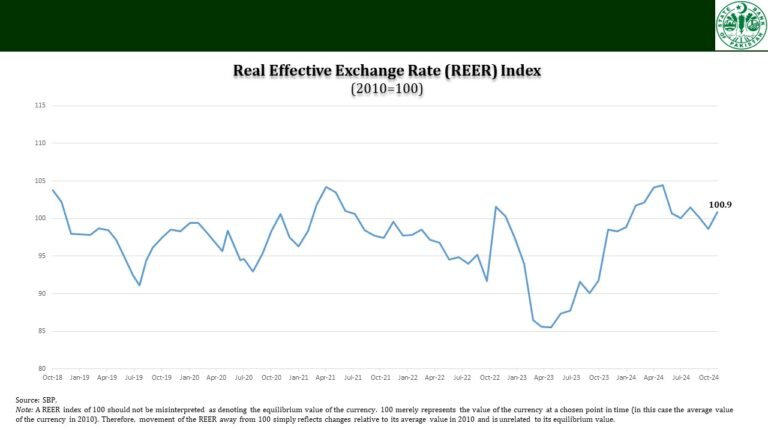 اکتوبر میں پاکستان کا Real Effective Exchange Rate (REER) انڈیکس 100 سے تجاوز کر گیا،، اسٹیٹ بینک کے مطابق اکتوبر میں ریئر انڈیکس 100.86 پر پہنچ گیا،، ایک ماہ پہلے یہ انڈیکس 98.64 تھا،،